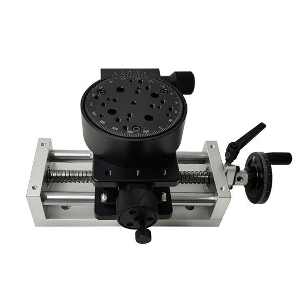 This manual XYR Three dimensional combined displacement platform is composed of 1 manual translation platform, 1 manual lifting platform and 1 manual rotation platform. PT-LX series sliding stage is selected for manual translation table, and various travel specifications can be selected. Manual lifting platform adopts PT-SD408, lifting stroke is 60mm. Manual rotating table PT-SD203, table diameter φ100mm.